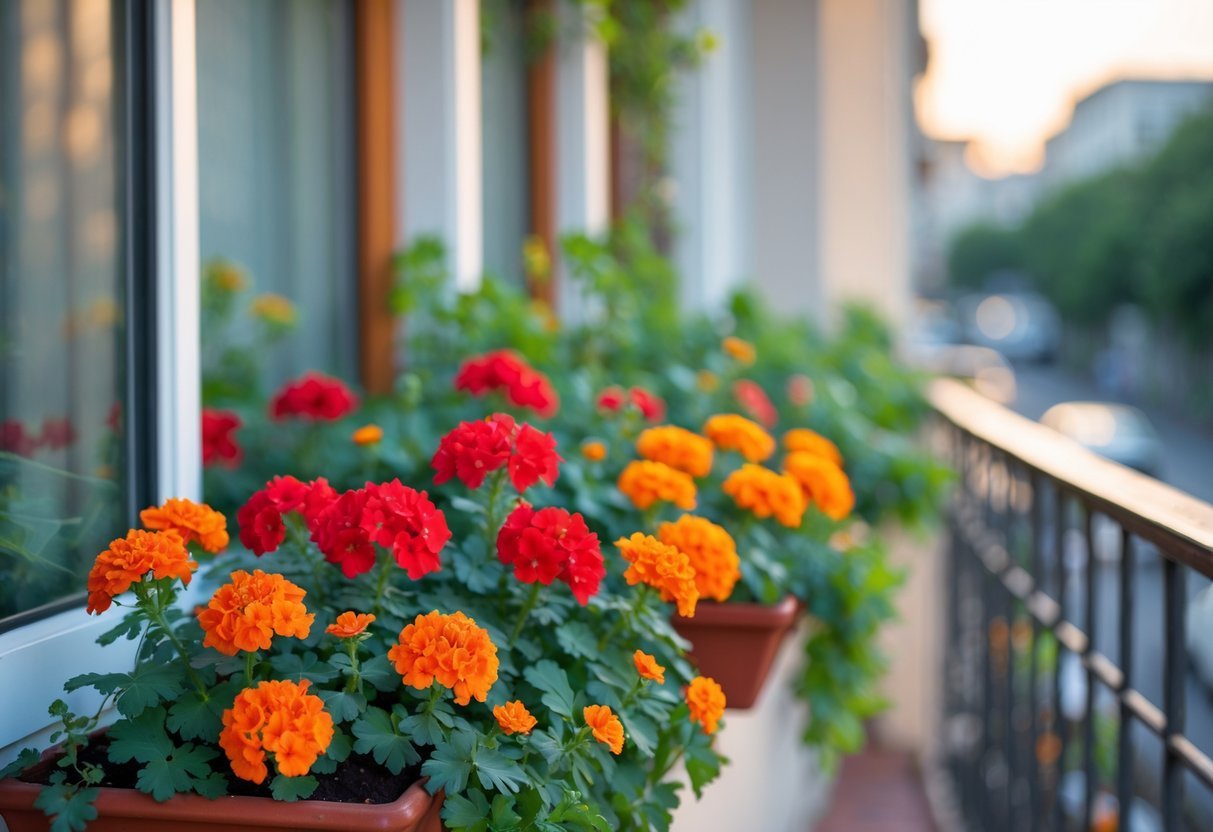 Plant geraniums for steady color and marigolds for bright contrast; both tolerate sunny balcony spots.