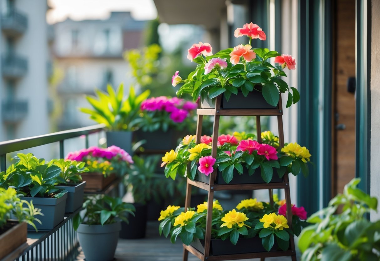 Place a tiered plant stand on your balcony to save space and show off color. Begonias give bold foliage and blooms, while impatiens add soft, continuous color.