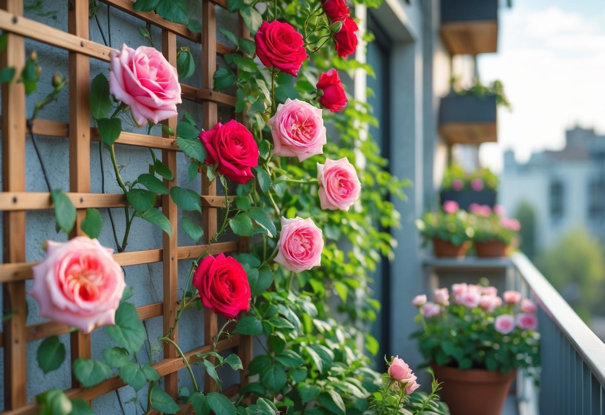 You can grow climbing roses on a small trellis to add height and scent to your balcony. Choose disease-resistant varieties and a slim trellis that fits your space.