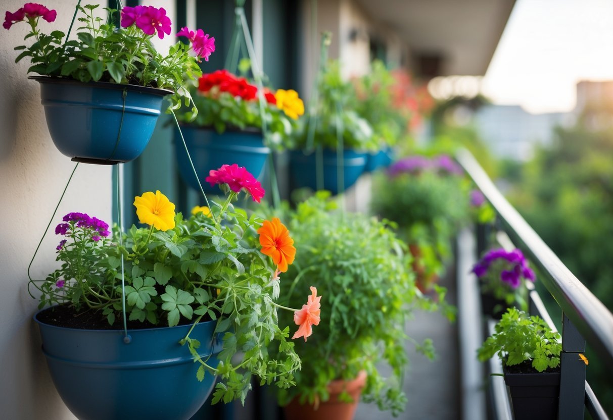 Hanging railing pots save floor space and bring plants up to eye level. You can grow petunias, geraniums, or compact herbs like basil and thyme.