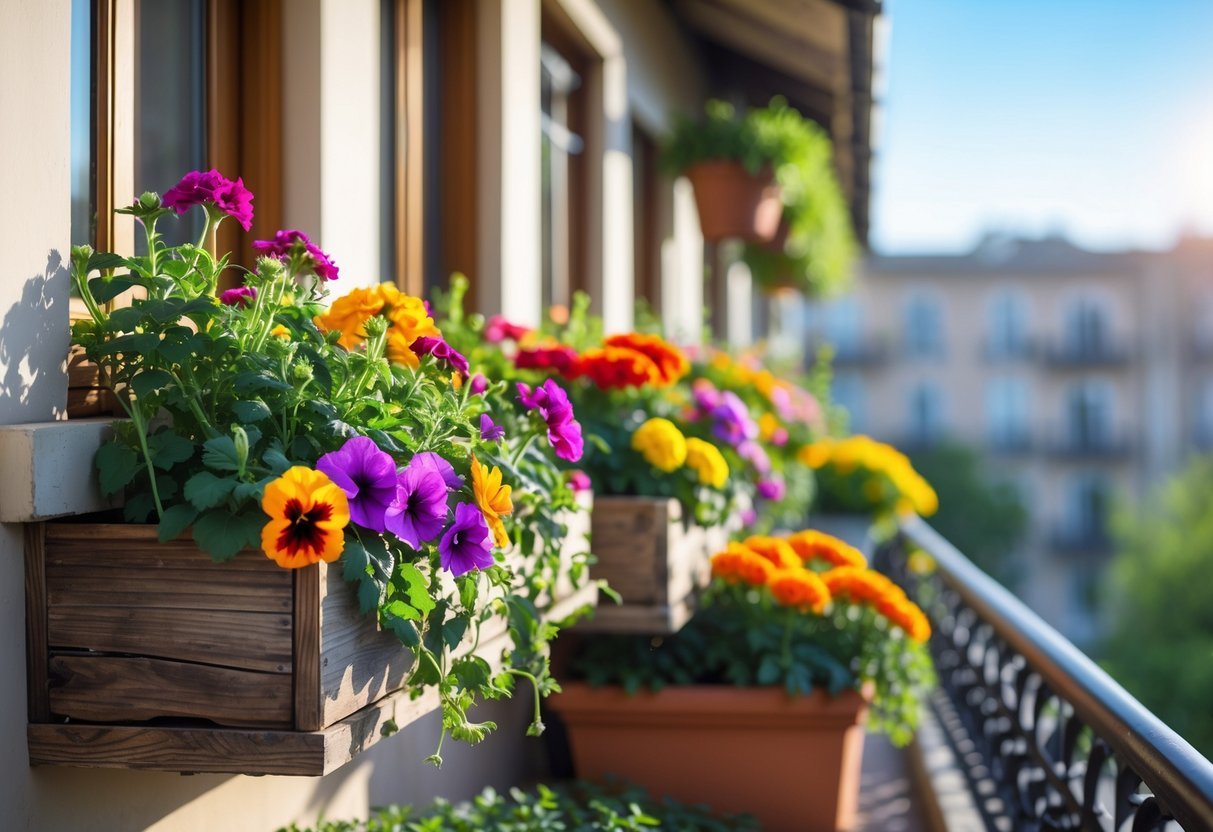 Place window boxes on your railing or ledge to add color and life to your balcony. Choose plants that match the season so they thrive and need less care.