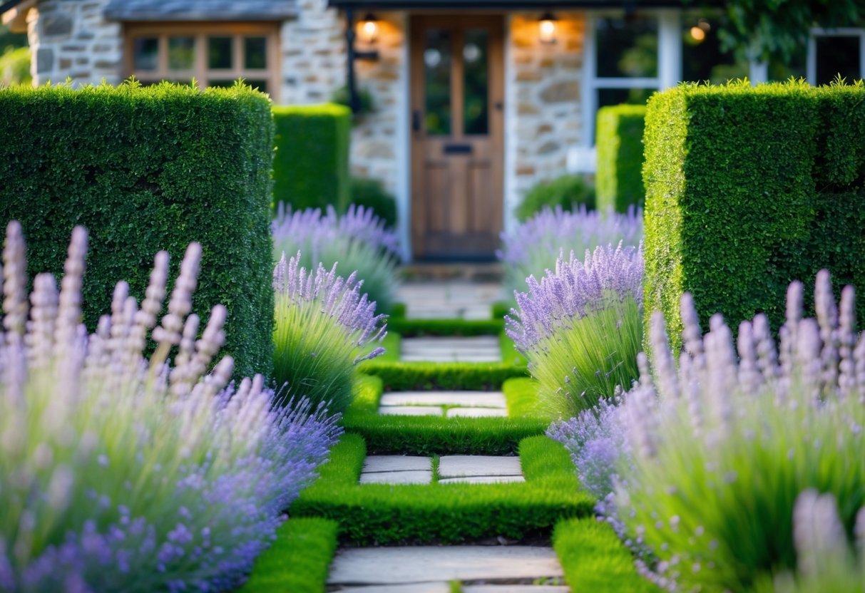 Plant lavender in front of the hedges for color, scent, and pollinator visits. The purple blooms contrast well with green hedging and need similar sun and well-drained soil.