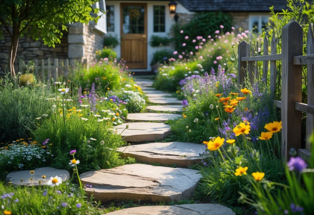 Stone and gravel fit the cottage look and match the article’s stone pathways lined with wildflowers. Flagstone or irregular stepping stones give a rustic, natural feel.