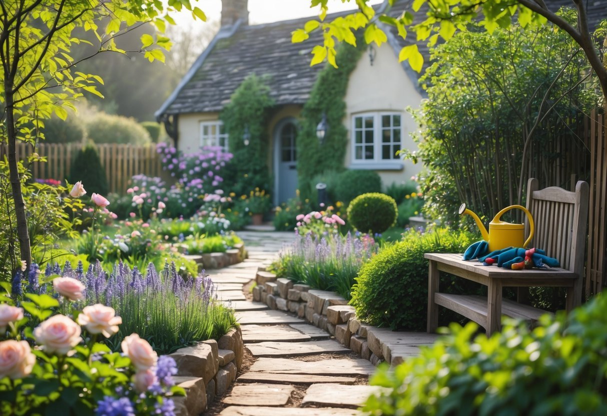 - Start with a clear layout and layered plant heights for instant cottage style.