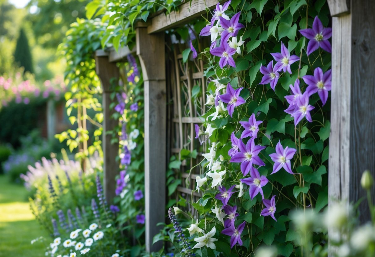 Choose clematis for bold, long-lasting blooms that climb well on trellises. You can use wood, metal, or netting depending on your style and budget.