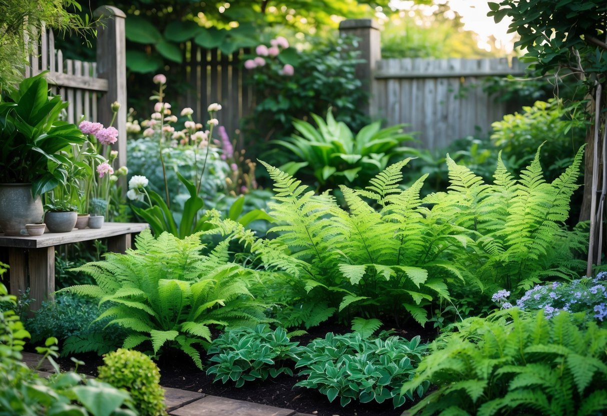 Add ferns to shady corners to bring soft, feathery texture that contrasts with cottage blooms. They handle low light and fill gaps without needing much care.