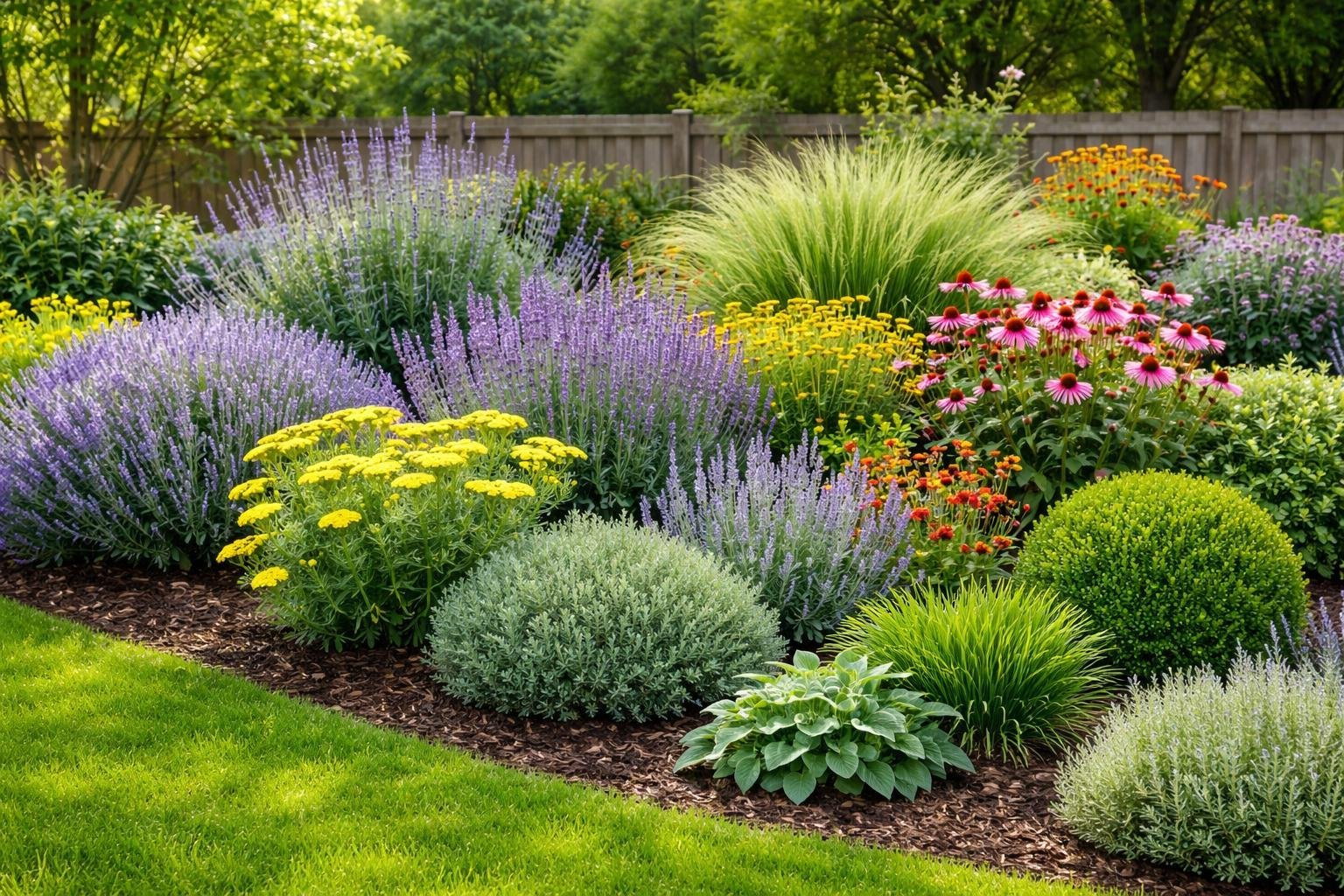 Drought-tolerant perennials often have waxy, hairy, or resinous leaves that deer dislike. Consider lavender, Russian sage, sedum, and ornamental grasses like feather reed grass. These plants survive dry spells and keep scent and texture strong.