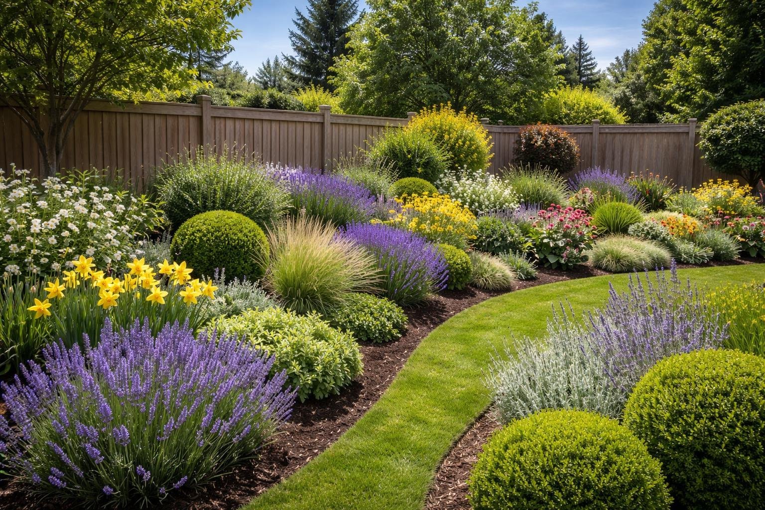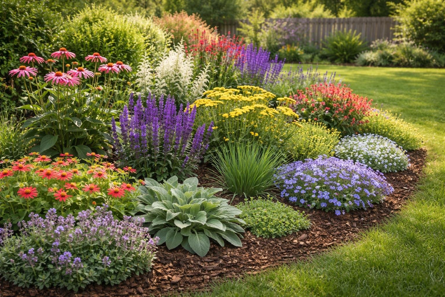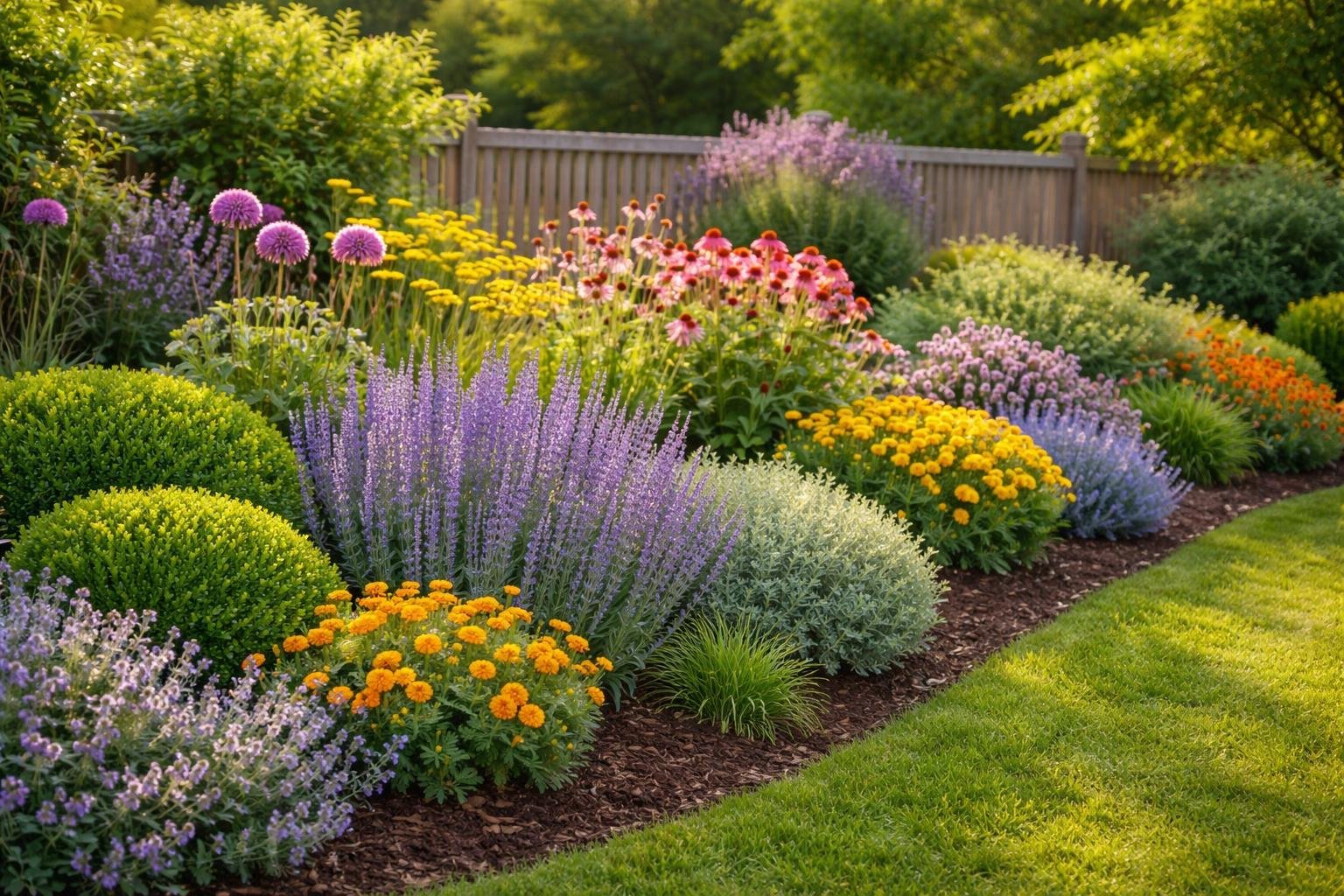 Choose perennials that return each year and that deer find unappealing. Good examples include lavender, Russian sage, and catmint — they have aromatic oils deer dislike. Plant them in groups of three to five for bigger scent impact and better bloom display.