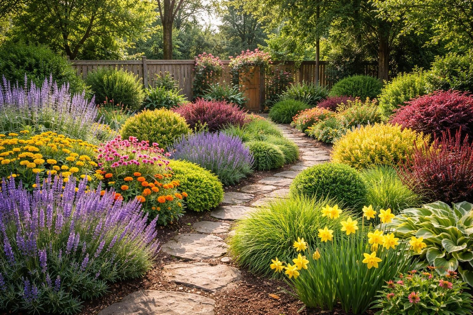 Stagger plant heights: low groundcovers in front, mid-height perennials in the middle, and taller shrubs at the back. This hides tender plants and reduces easy access.