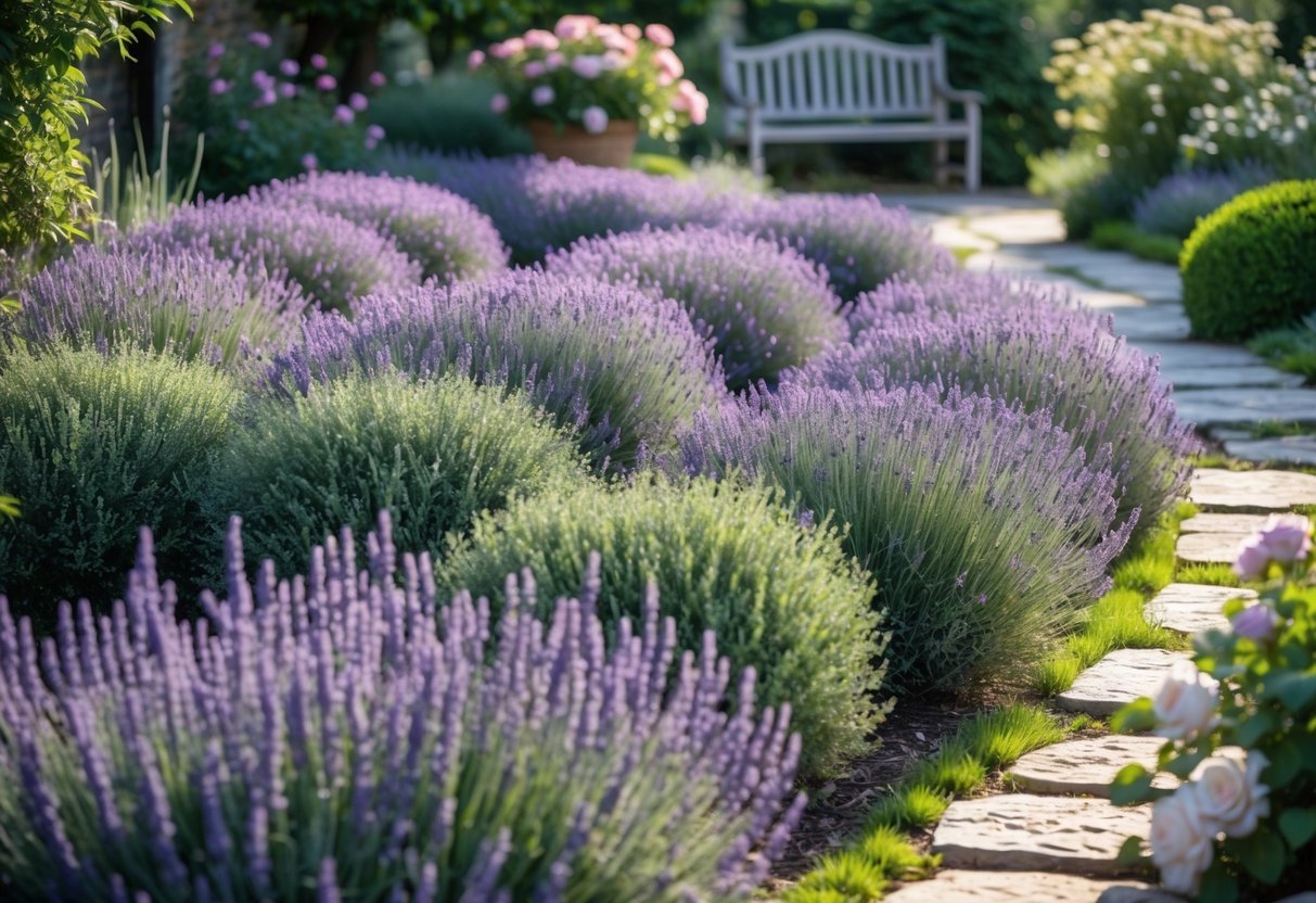 Plant lavender hedges along walkways for scent and a neat edge. Add climbers over low shrubs to create vertical interest and soft transitions.