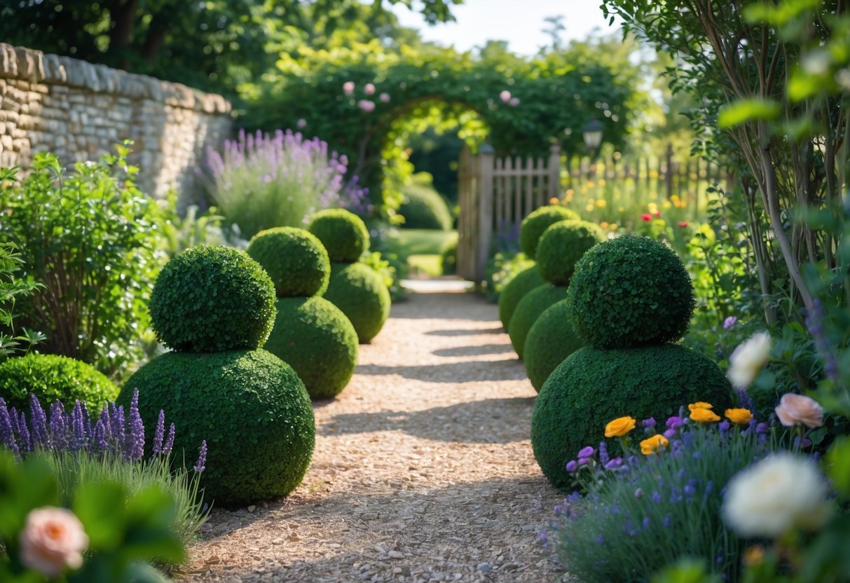 Add sculpted boxwood balls to give your cottage garden tidy form and year-round green. They bring a formal touch without clashing with informal flower beds.
