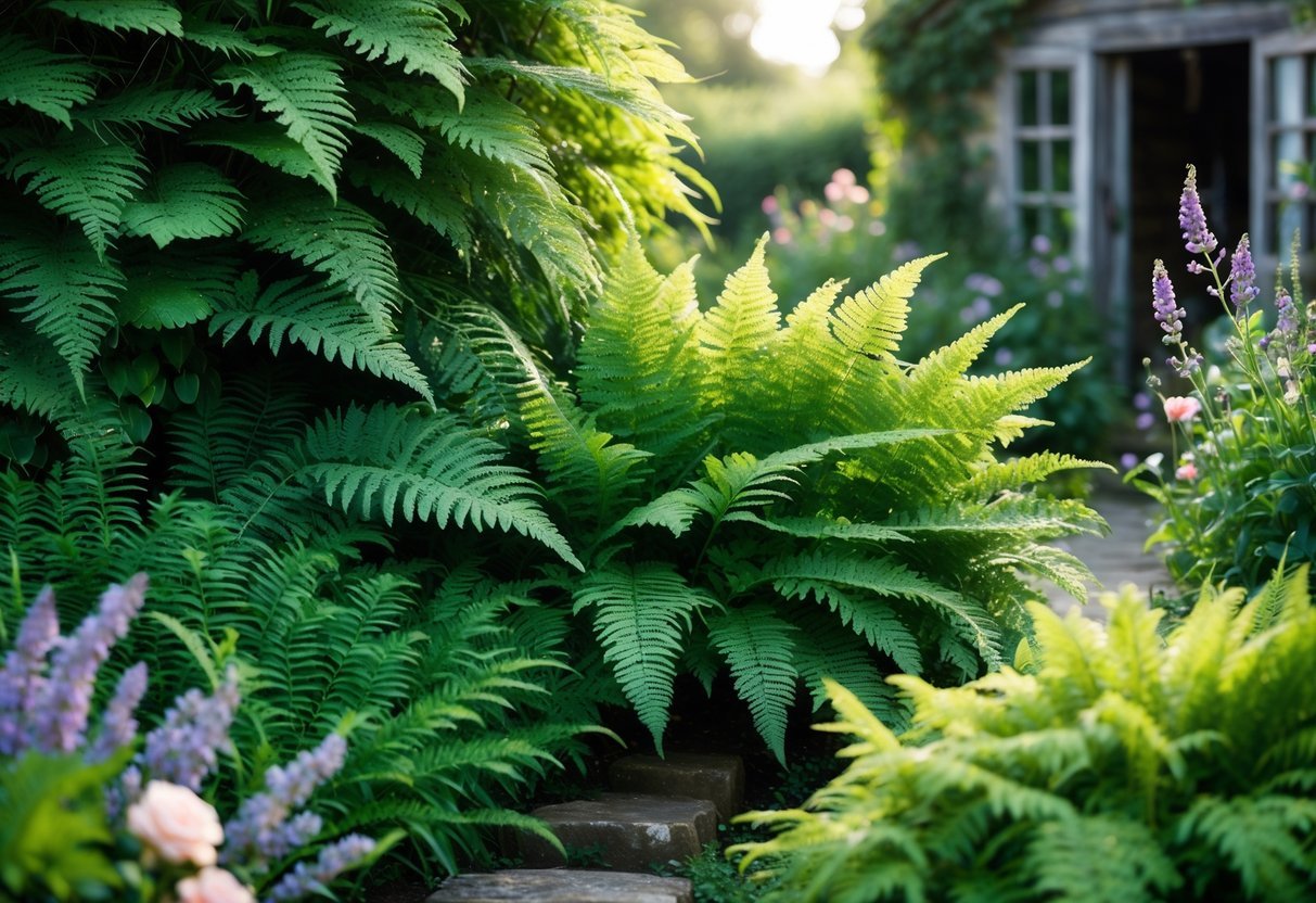 Use ferns to add soft, feathery texture to shady corners of your cottage garden. They fill gaps between flowering plants and create a calm, layered look.