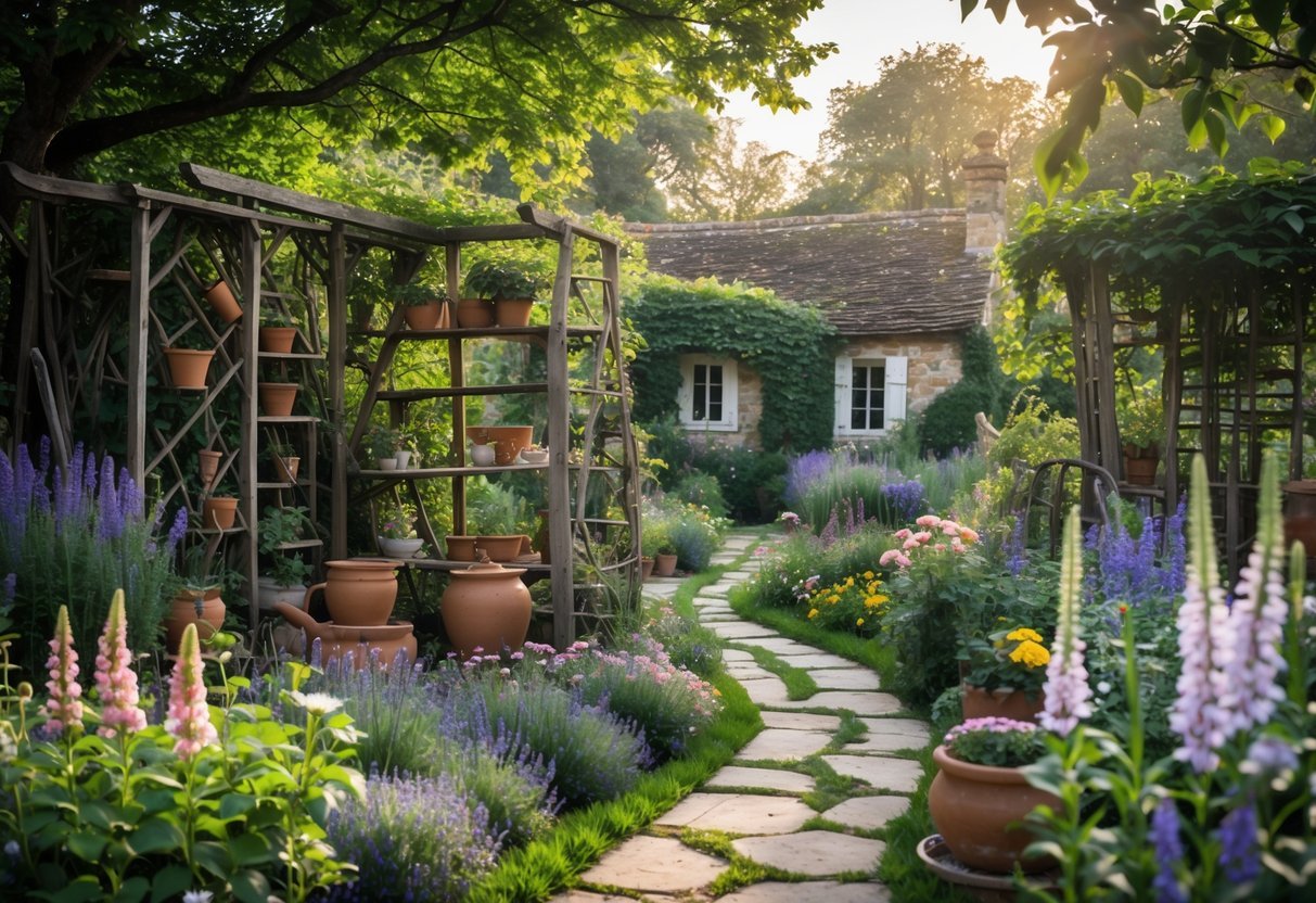 Mix vertical elements—trellises, arbors, short fences—with low beds to add depth. Keep beds informal: curved edges, layered heights, and plants spilling onto walkways. Include one focal point, such as a rose-covered arch, a weathered urn, or a small stone wall, to anchor the design.