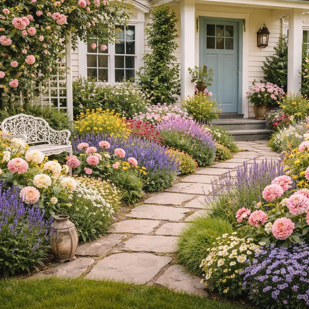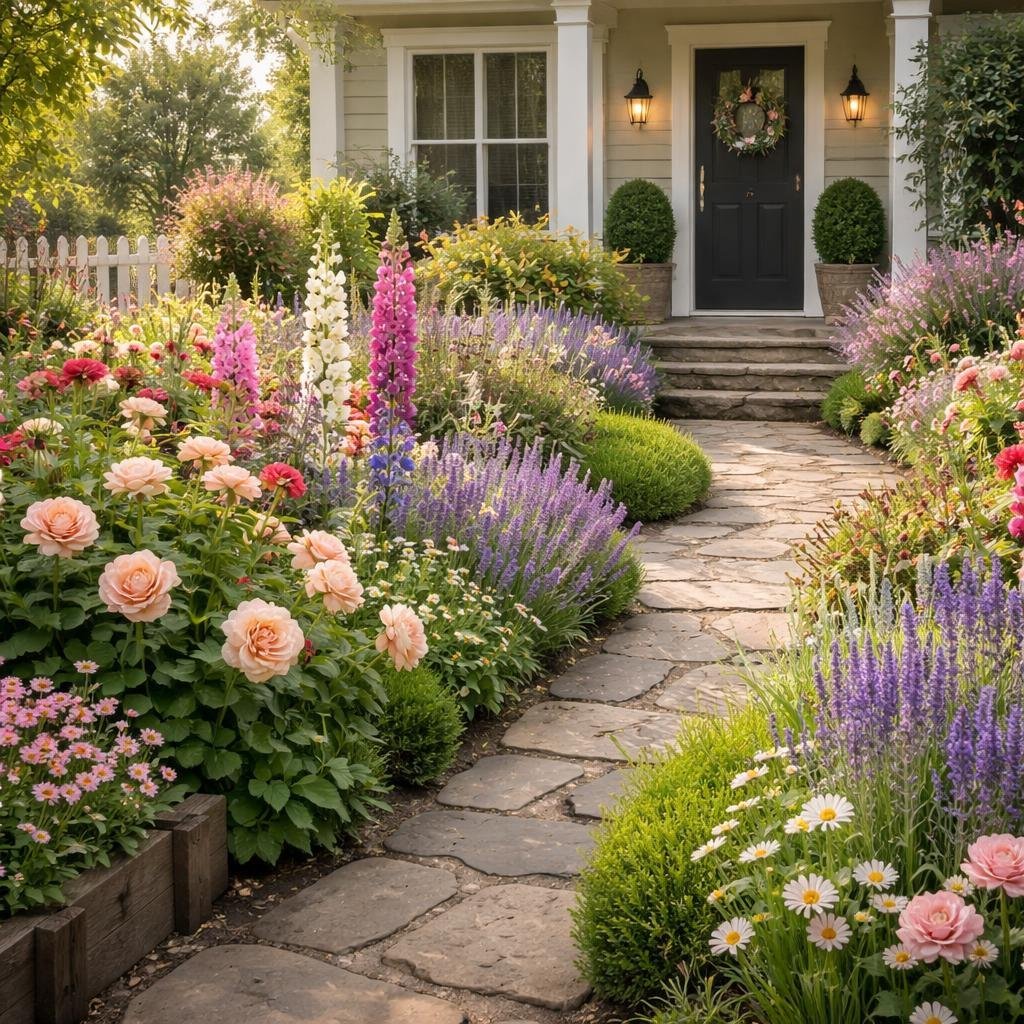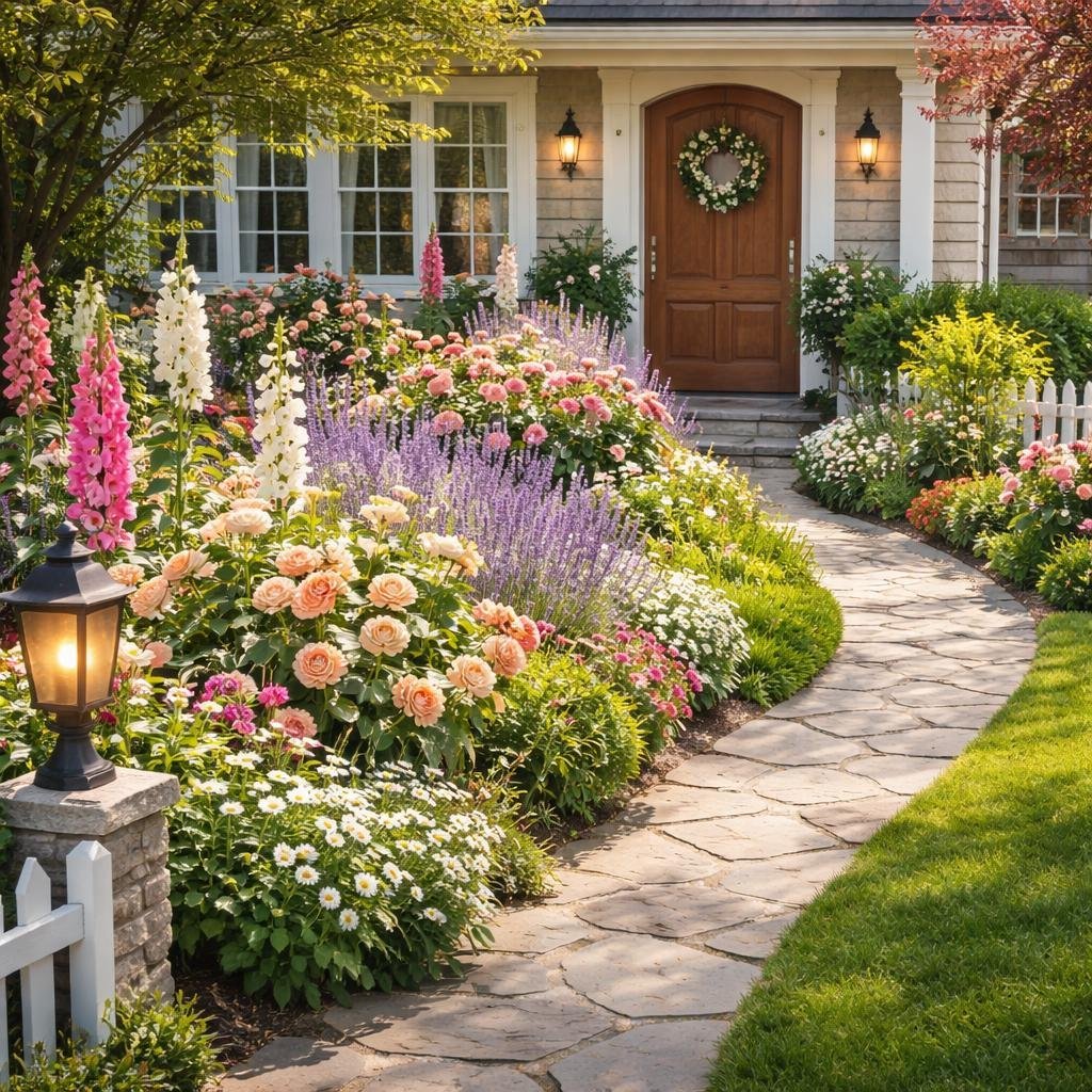 Romantic Front Yard Flower Bed Ideas with Cottage Garden Blooms & Front Entry Landscaping Tips