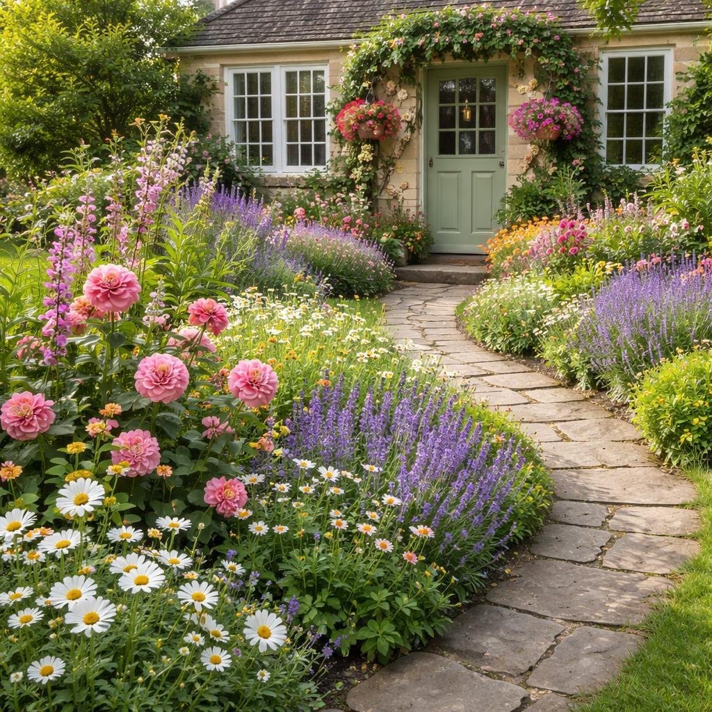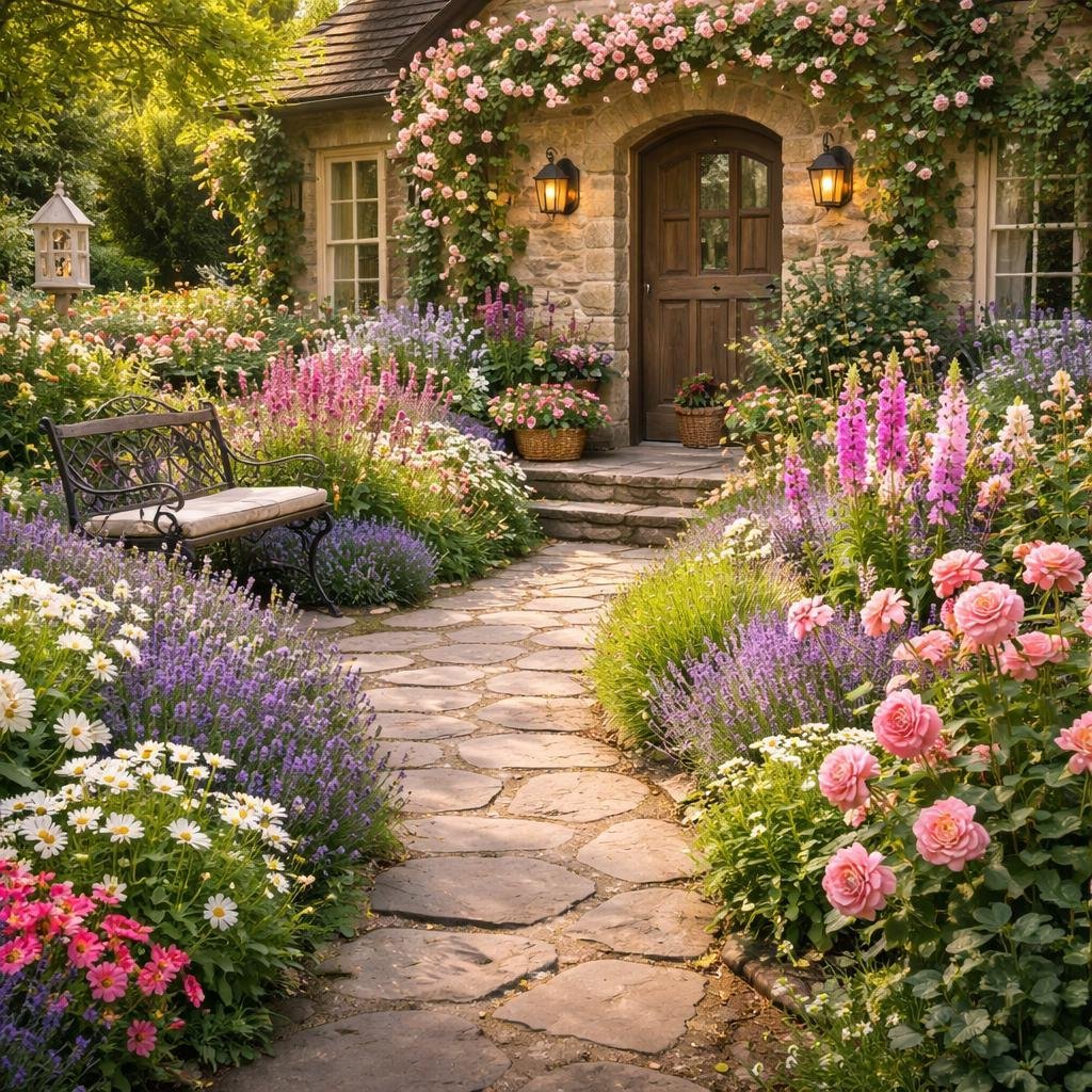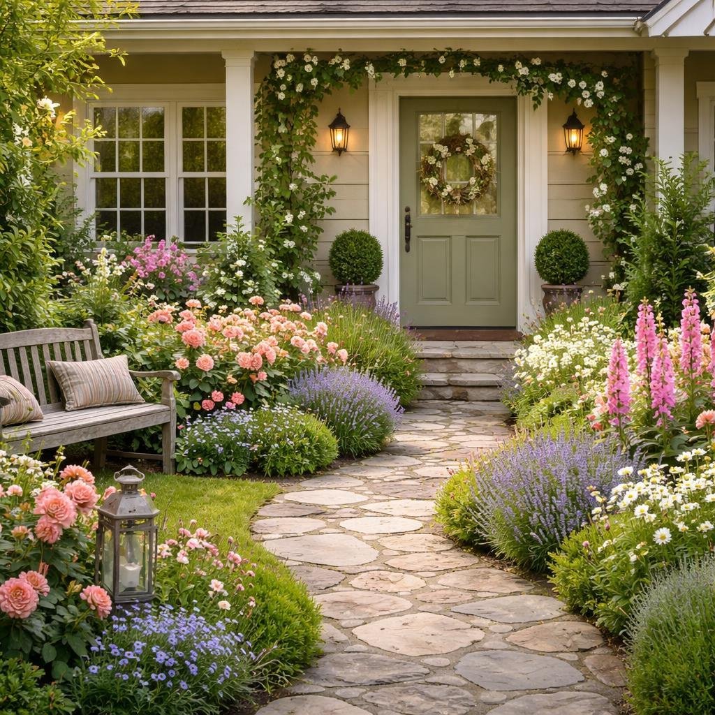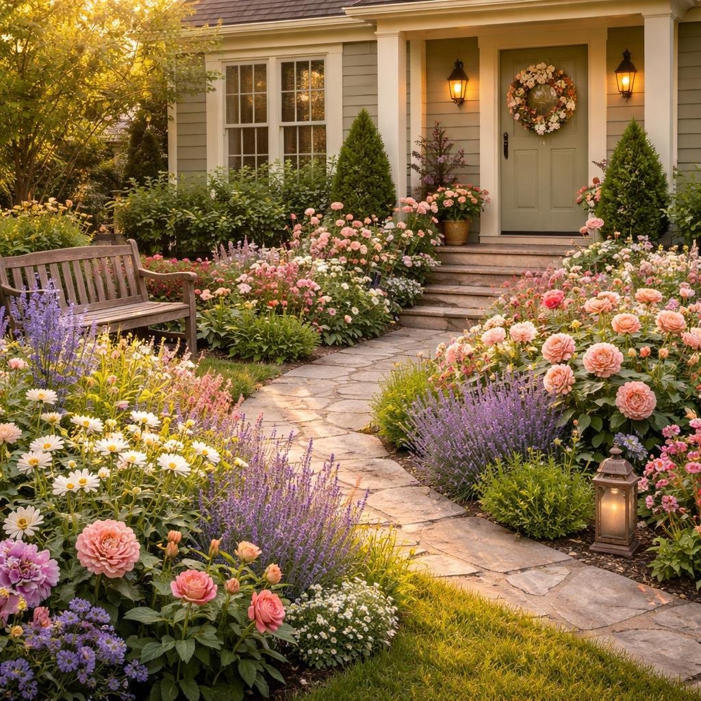 Romantic Front Yard Flower Bed Ideas with Cottage Garden Blooms & Front Entry Landscaping Tips