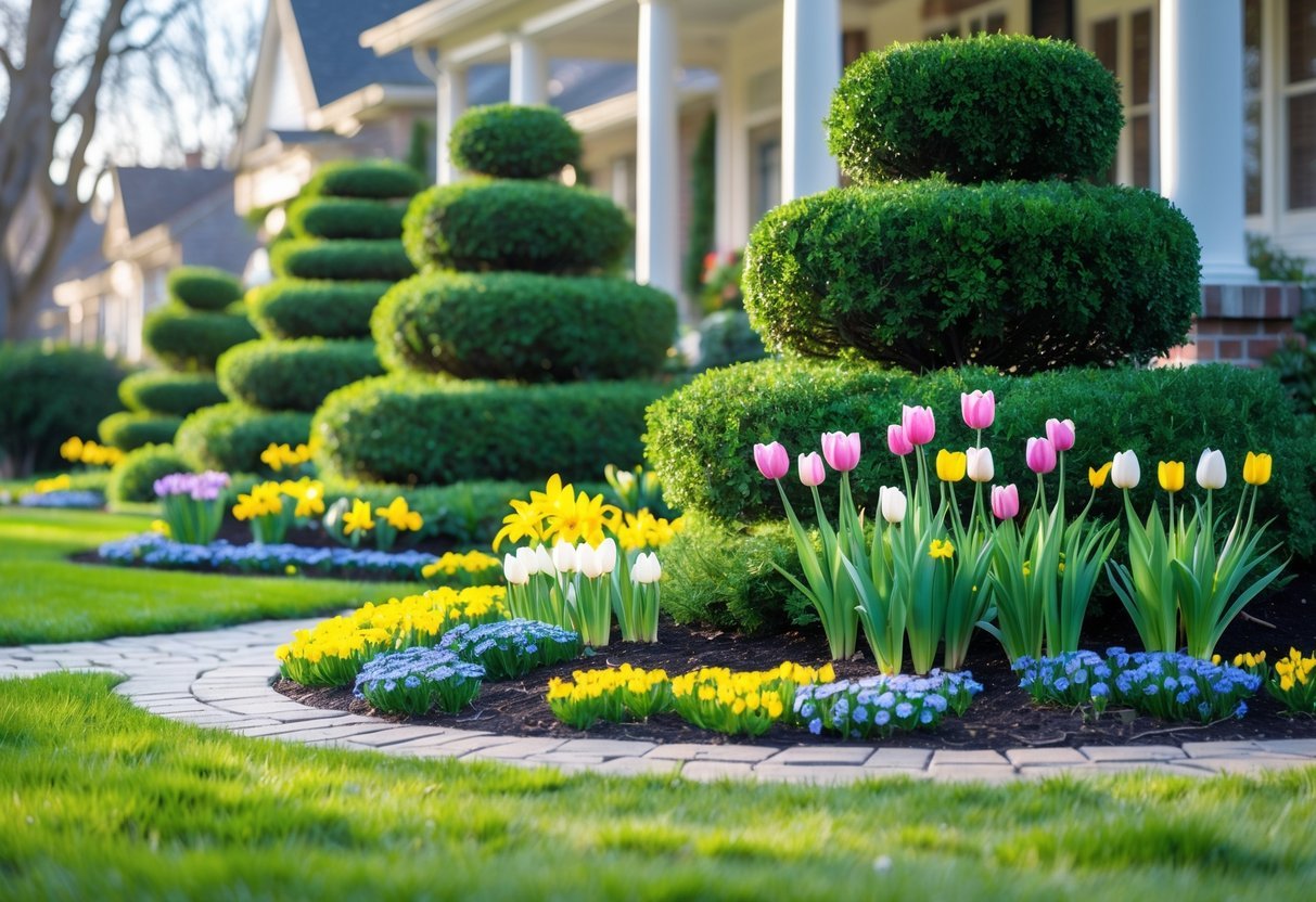 Layering shrubs adds depth and structure to a front yard garden. Taller evergreen shrubs form the back layer, giving year-round greenery. Medium and smaller shrubs go in front, creating a natural step-down effect.