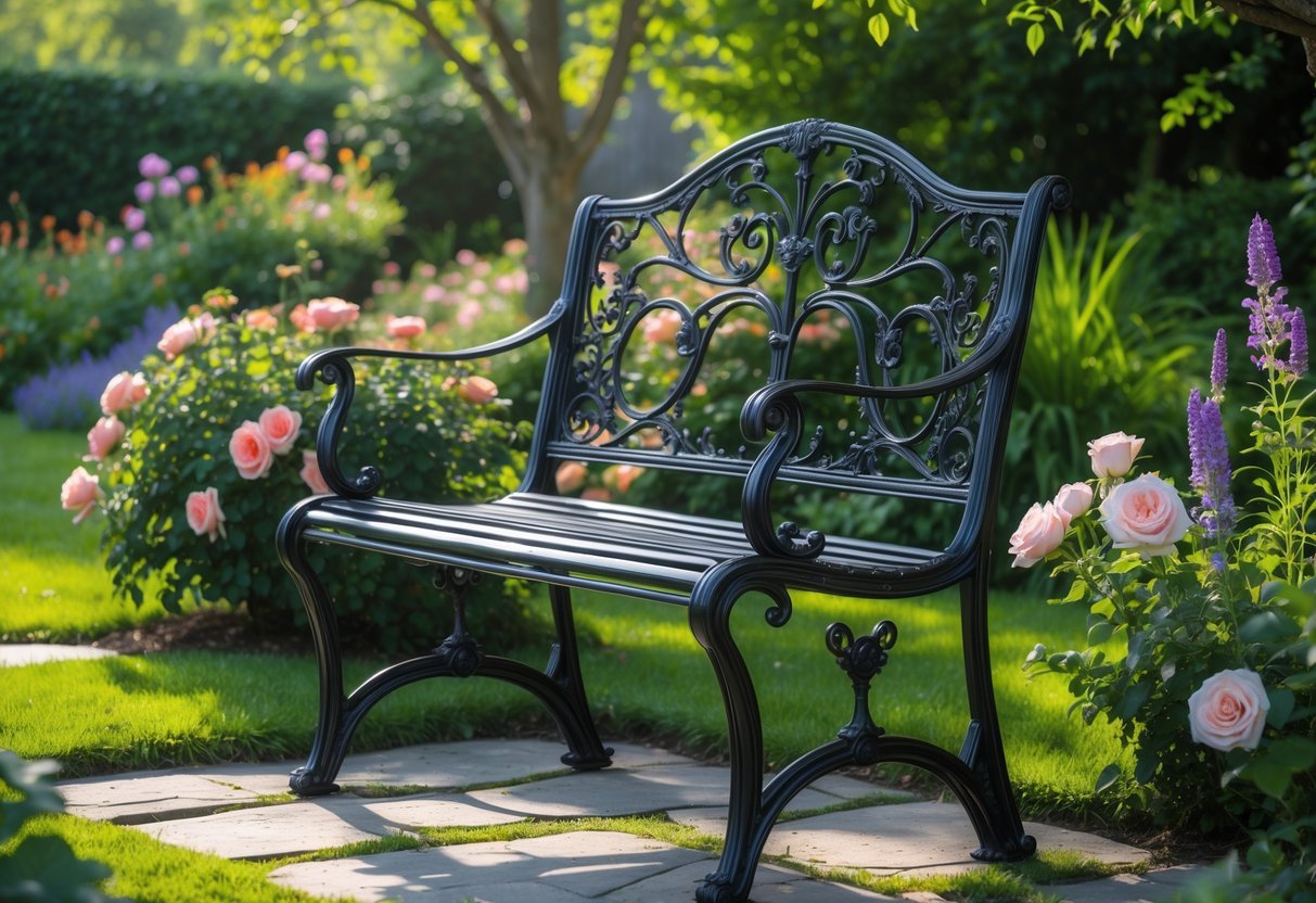 A wrought iron bench adds a timeless look to your garden. Its scrollwork and clean lines fit formal and cottage styles.