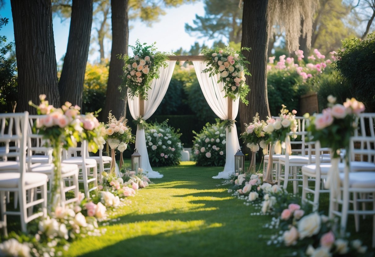 You’ll emphasize soft, layered florals and classic details. Pick a color palette of blush, cream, sage, and soft lavender. Use overflowing urns, climbing roses on arbors, and loose garlands on tables to create a lush, lived-in look.