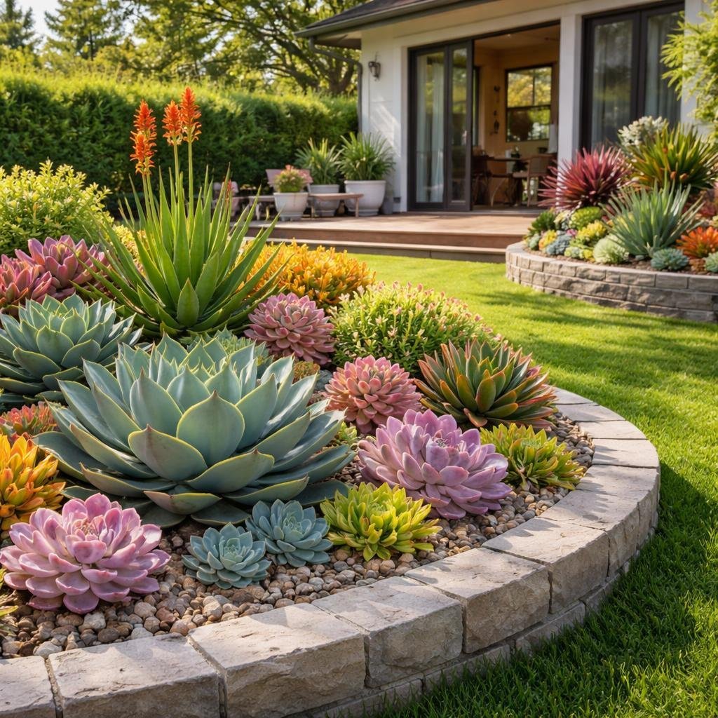 Use contrasting colors—blue-green agaves against red sedums—for instant impact. Keep spacing in mind: allow mature spread for each species (check plant tags), so patterns don’t collapse over time. Use gravel paths or bands of crushed stone to define pattern edges and keep soil from eroding.