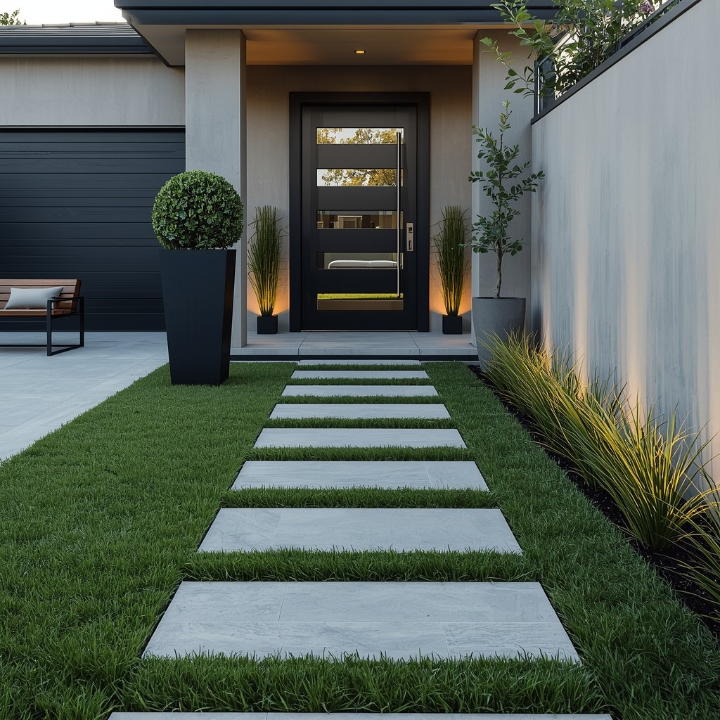 Frame the entry with matching planters or vertical screens and add a clear walk line with rectangular pavers. Integrate smart lighting and house numbers in a minimal font for a tailored look.