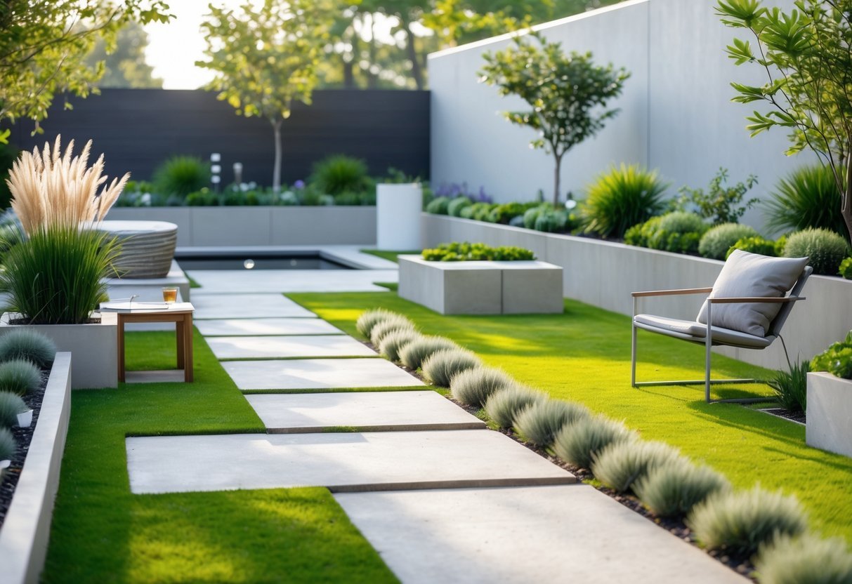 Use layered hardscape planes: a narrow concrete strip, a gravel bed, and raised planters to add depth. Replace a full lawn with lawn alternatives—gravel, groundcover, or synthetic turf in careful shapes.