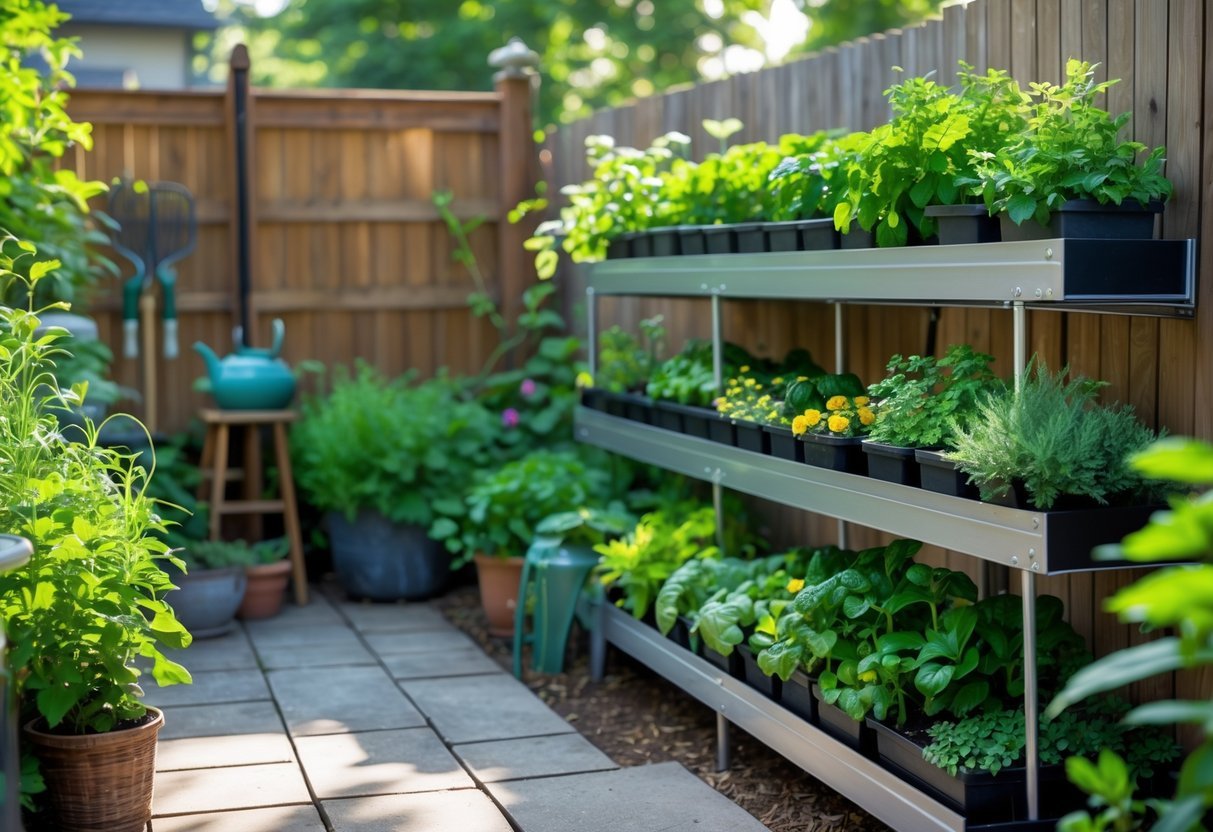Install multi-level plant shelving for pots and herbs to create height and visual interest. Use a compact raised garden bed for vegetables and flowers to keep plants organized.