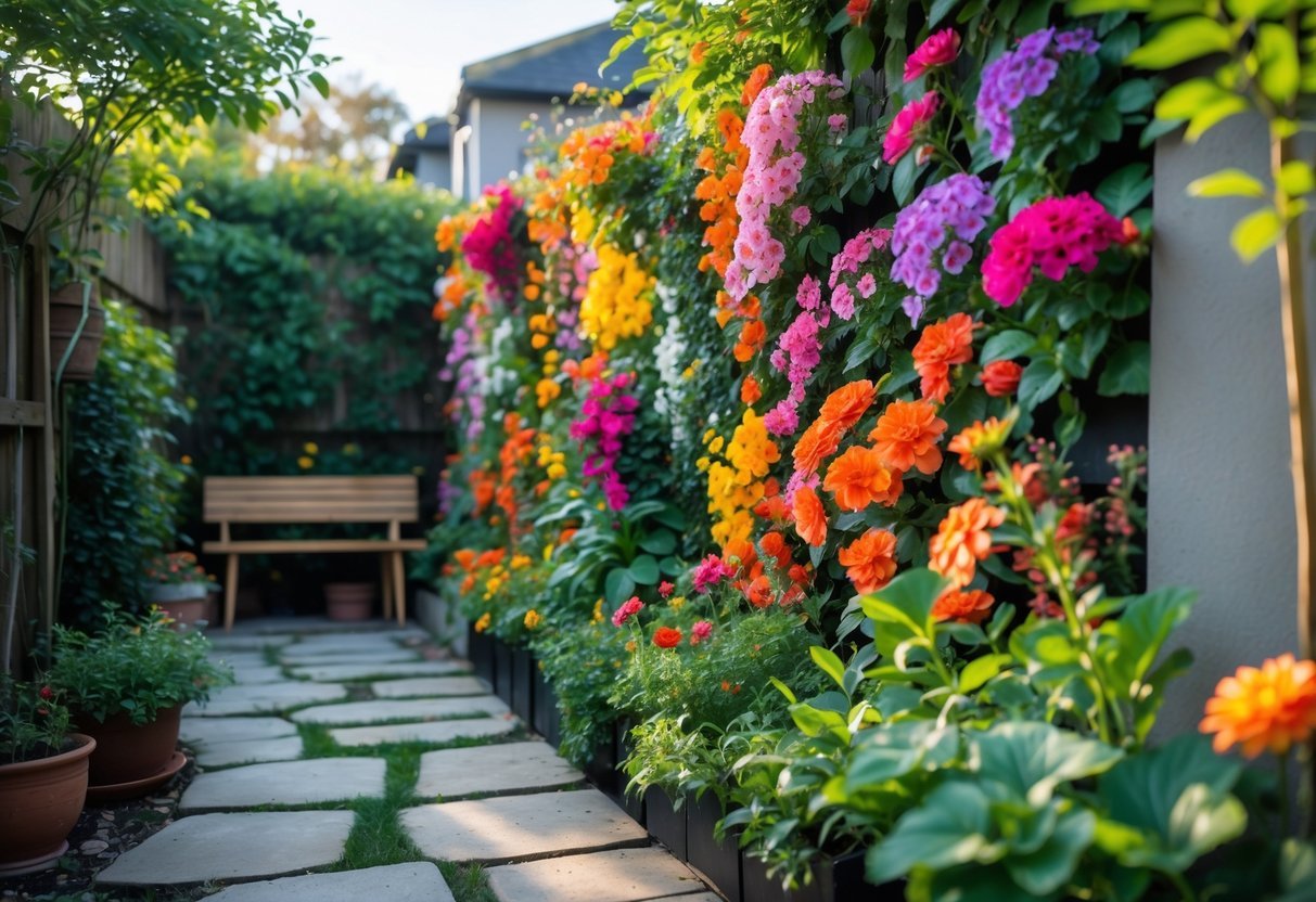You can turn a plain fence or wall into a bright flower display that saves ground space. Use pockets, hanging pots, or a trellis to hold mixed annuals and perennials.