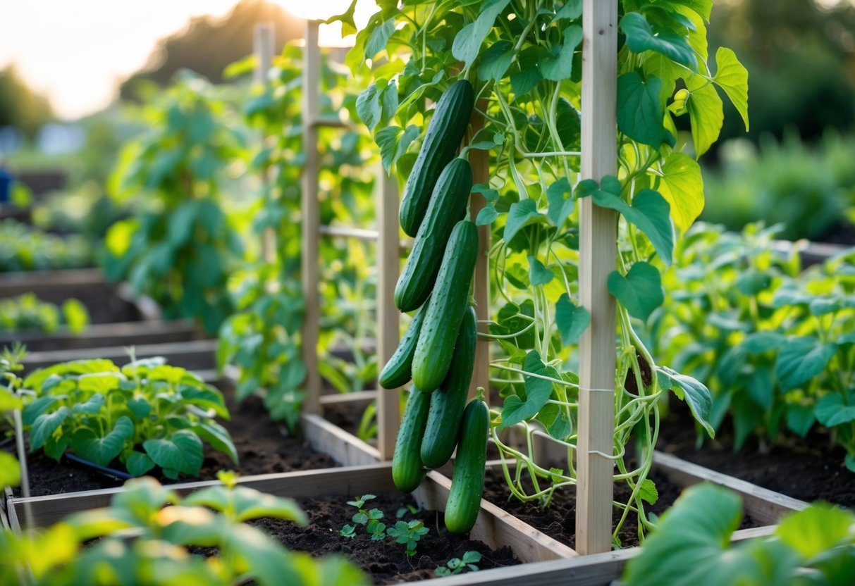 You can save space and improve airflow by training cucumbers and pole beans up a trellis. Vertical growth keeps fruit off the soil, making harvesting easier and reducing rot.