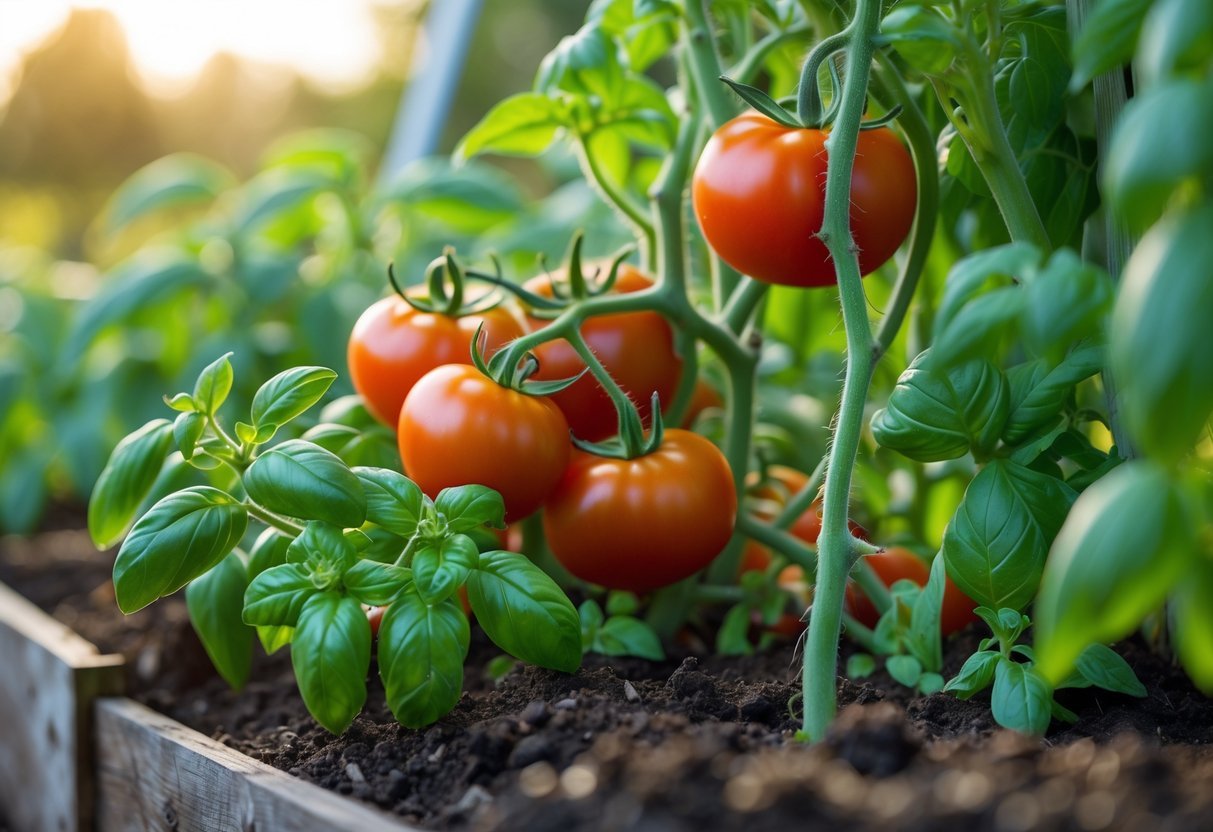 Harvest basil regularly to keep it bushy and prevent shading. Water tomatoes at the soil, not the leaves, to avoid disease while both plants grow.