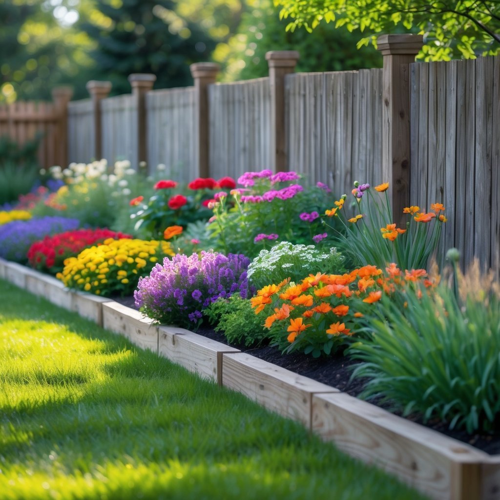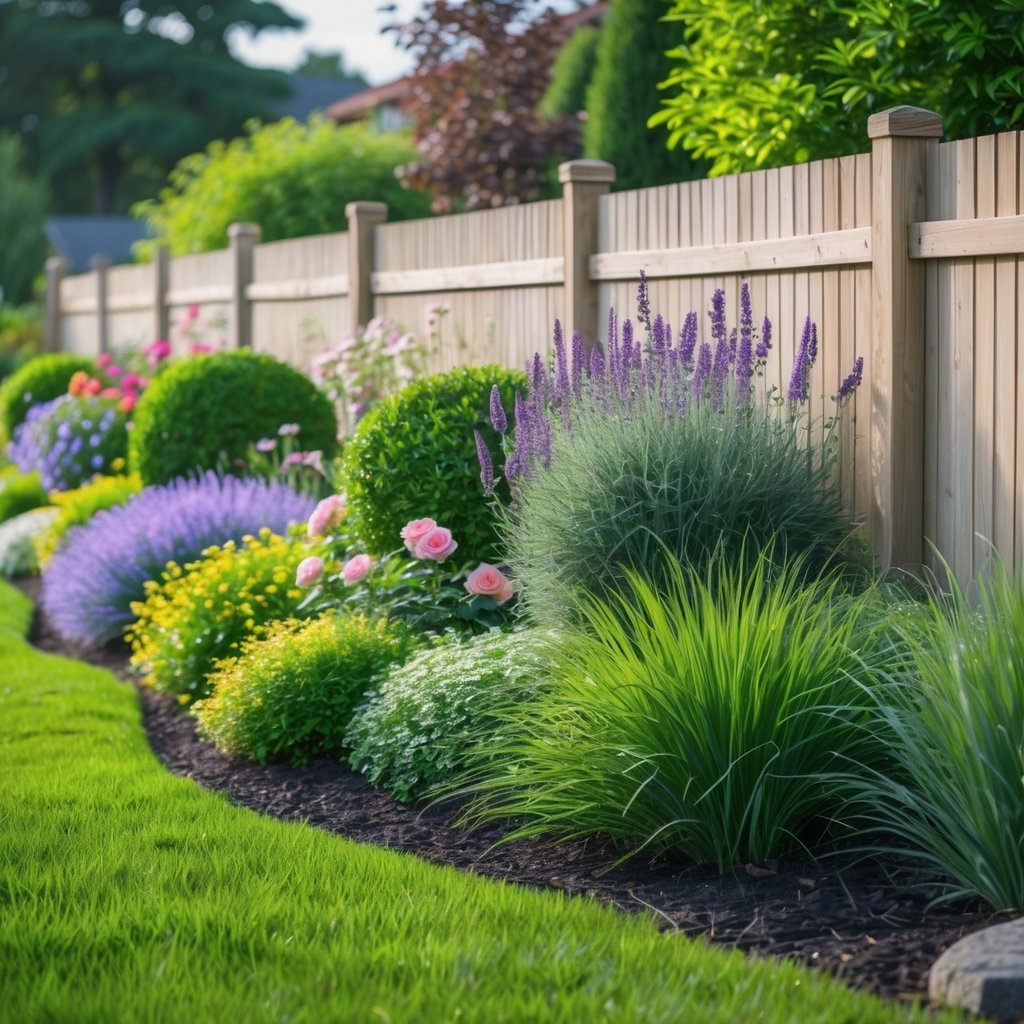 Choose plants with different textures and bloom times to keep interest through the seasons. This also helps with privacy and hides plain fence panels.