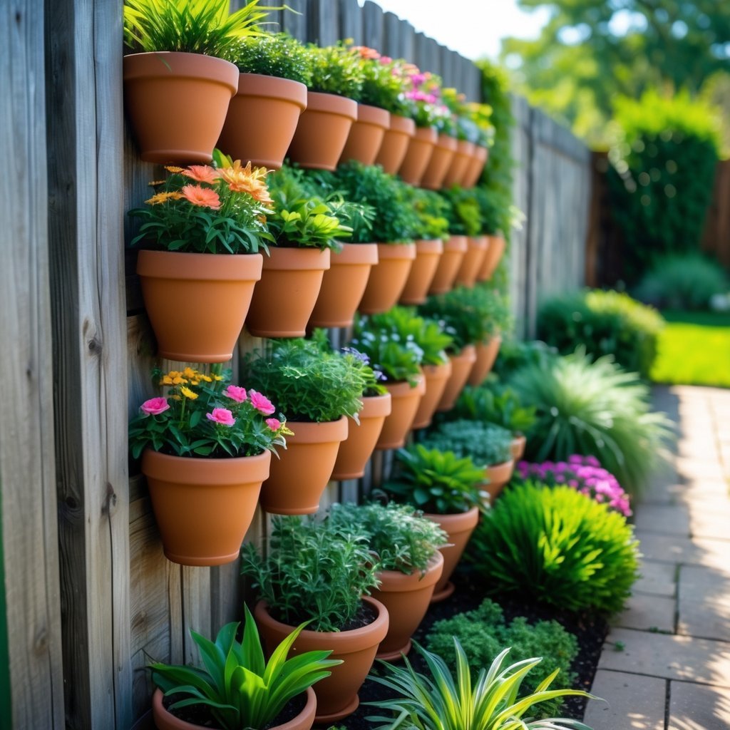 You can mount terracotta pots on your fence to add color and life without taking ground space. Mix herbs, succulents, and seasonal flowers for variety and easy maintenance.