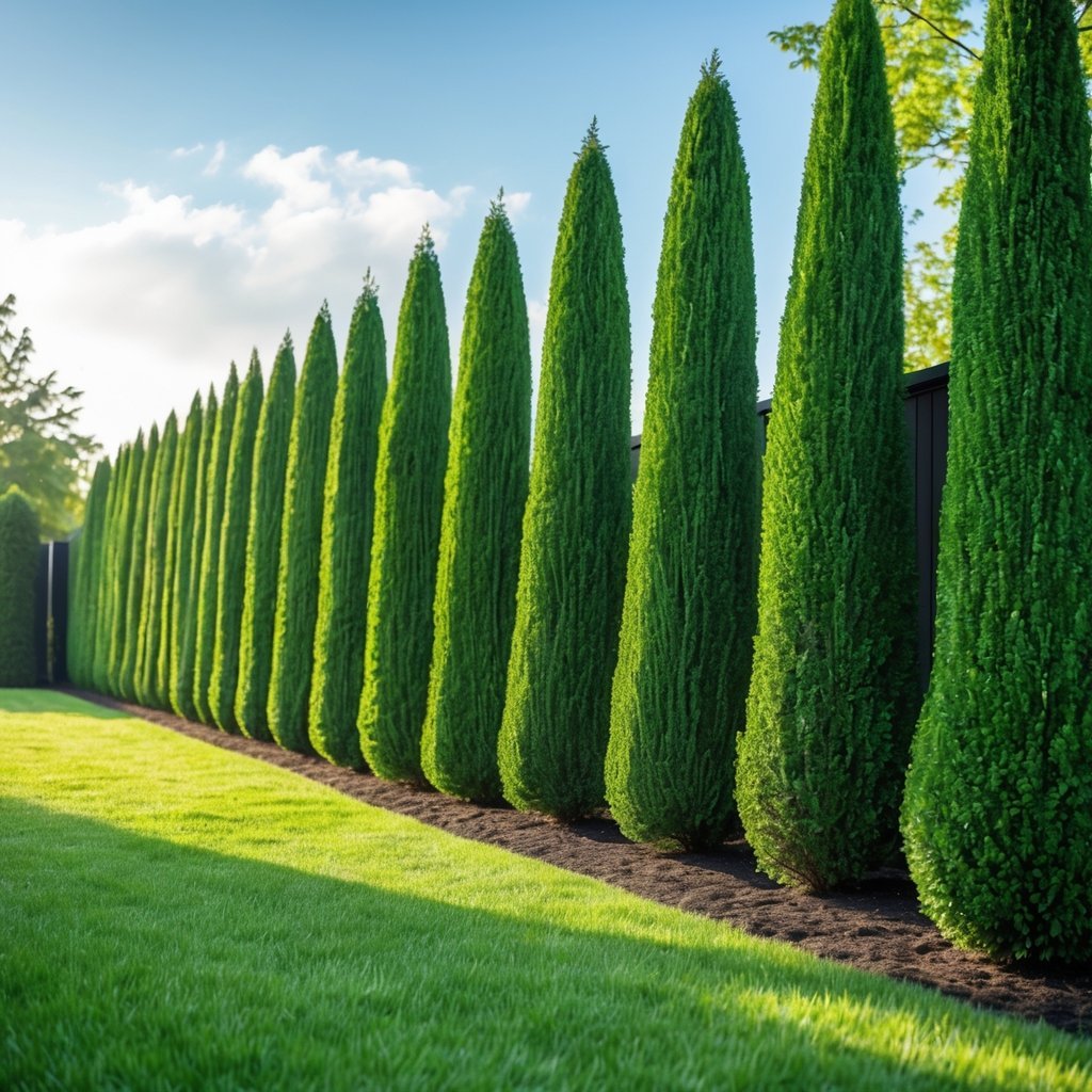 Plant arborvitae in a straight row to create a dense, year-round screen that blocks views and wind. Choose varieties like Green Giant for fast growth or Emerald Green for a narrower profile if space is tight.