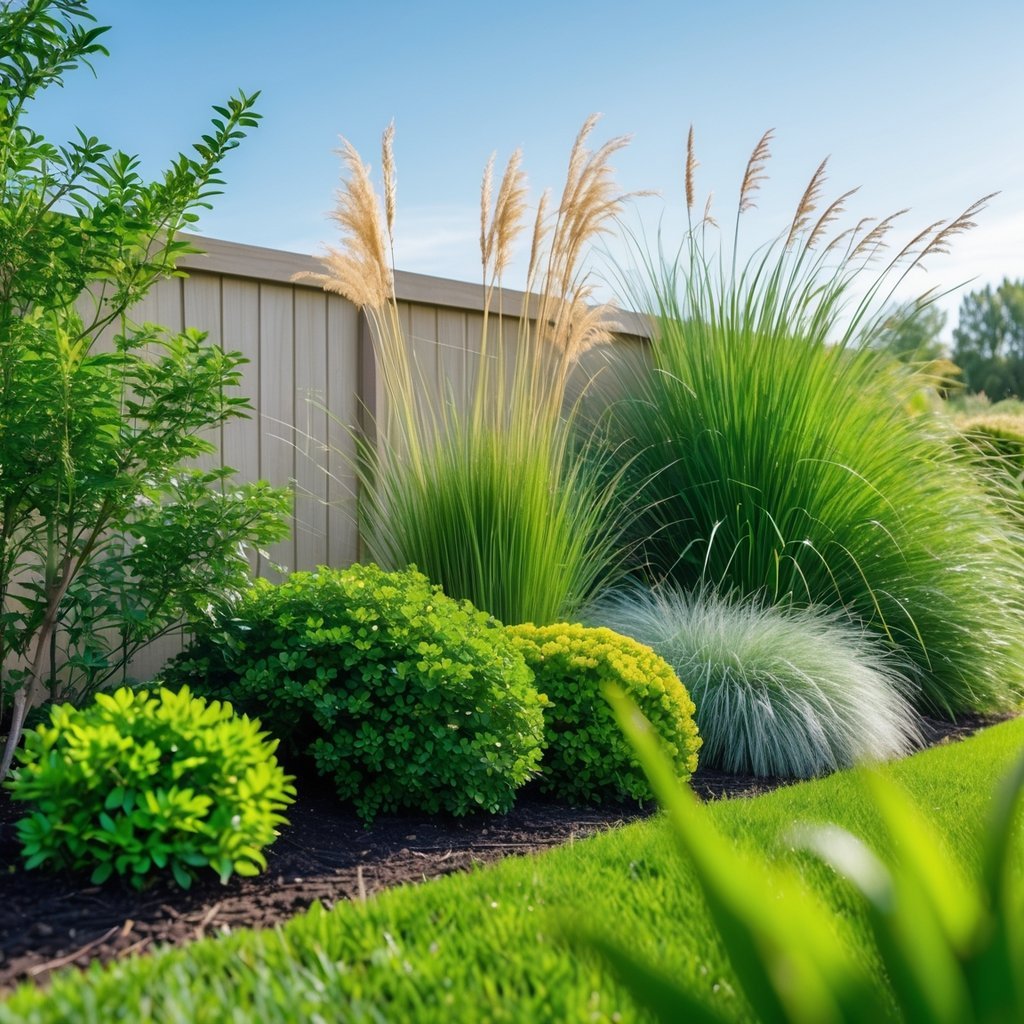 Mix shrubs and ornamental grasses to soften your fence and add year-round interest. Shrubs give structure and color, while grasses bring movement and texture.