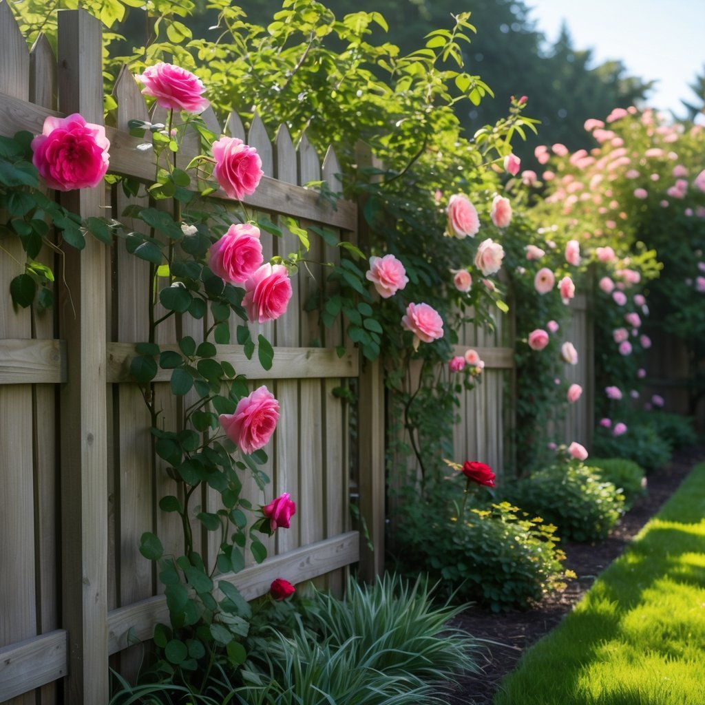 Climbing roses, clematis, or jasmine work well on wooden trellises attached to the fence.