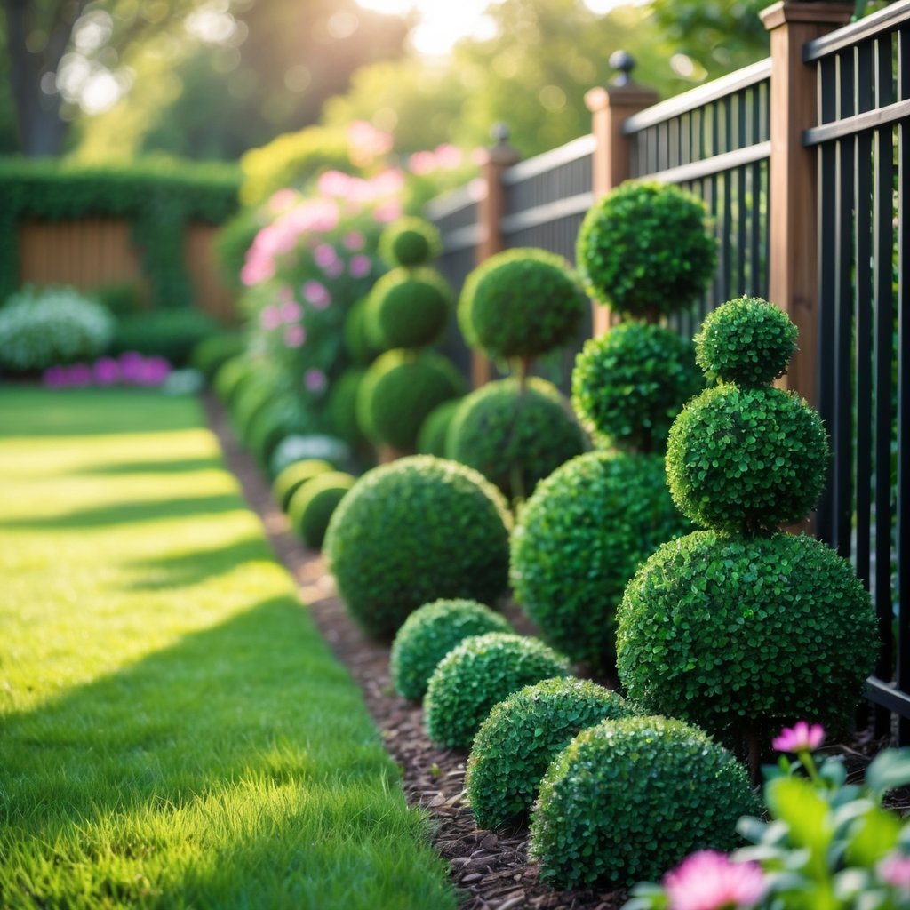 You can place boxwood topiaries along the fence to add formal structure and year-round green.