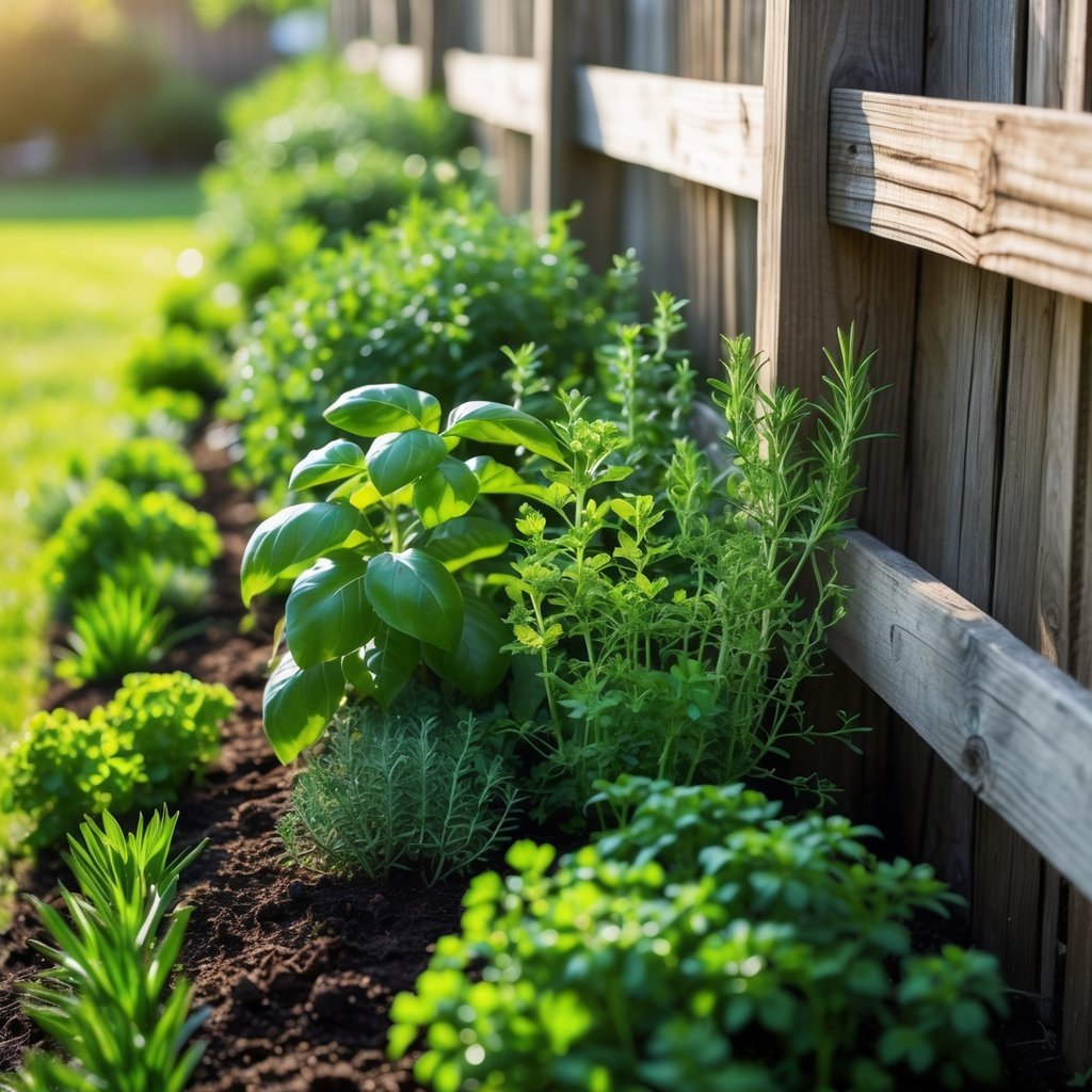 Plant herbs along your fence to add scent, color, and easy access for cooking. Choose thyme, rosemary, basil, and mint for varied heights and uses.