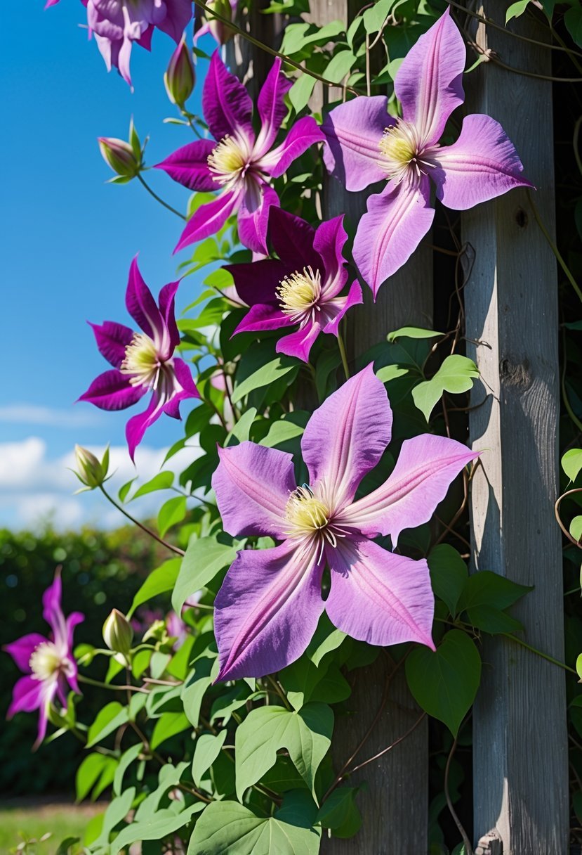 You can grow clematis for big, colorful blooms that light up fences and trellises. Many varieties do best with about six hours of sun, but they need cool, shaded roots.
