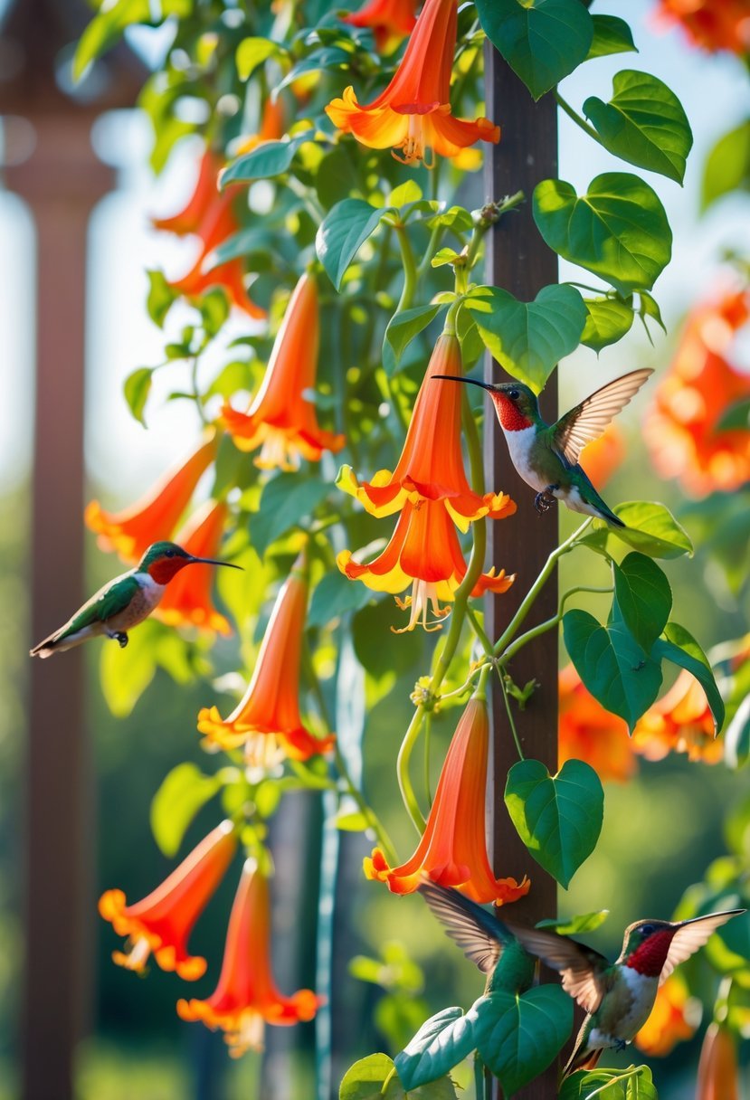 5) Trumpet Vine – trumpet-shaped blossoms that attract hummingbirds