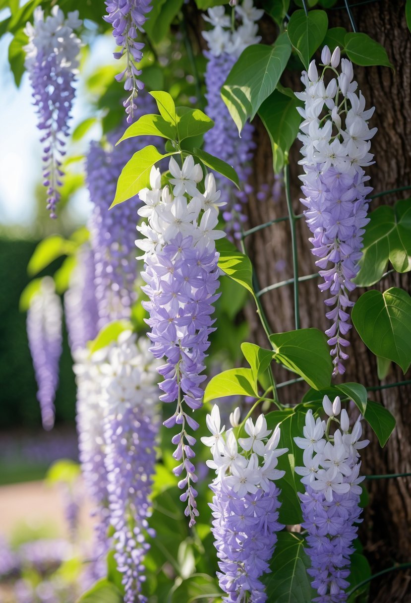 Wisteria gives you long, hanging flower clusters in purple, blue, or white. Plant it where it gets full sun and deep, well-drained soil for best blooms.