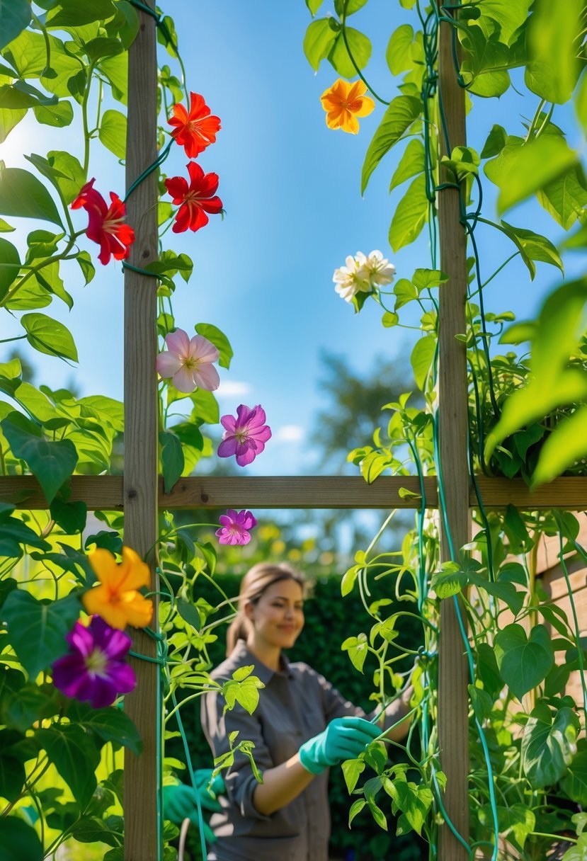 Match the support to the climber’s habit. Lightweight twining vines like sweet peas and morning glory suit wire or bamboo obelisks. Heavy bloomers such as climbing roses or wisteria need strong timber or metal trellises anchored into the ground.