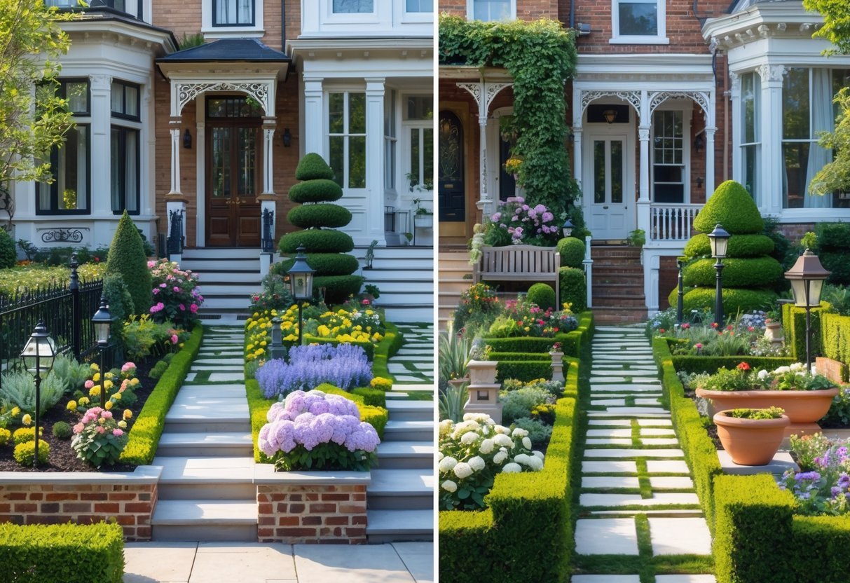 Victorian front gardens favor order, color, and detail. You’ll see balanced layouts, layered planting, and decorative hardscape that all aim to welcome visitors and frame the house.